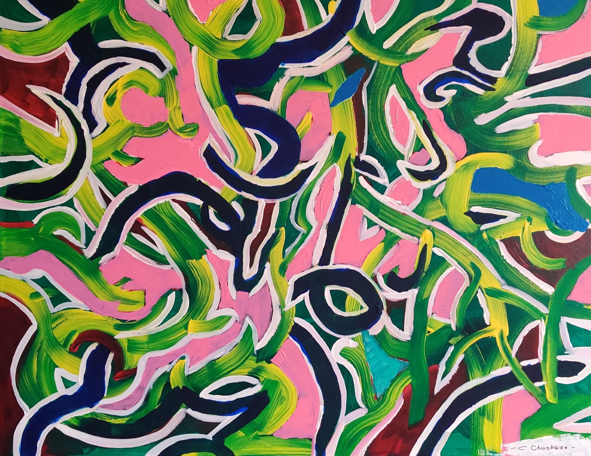 Hope is an original abstract acrylic painting on canvas (80 × 100 cm) that explores balance, emergence, and optimism through layered texture, color, and controlled gesture. Created with brush and palette knife techniques, the artwork features heavy impasto and layered acrylics, resulting in a tactile surface that interacts beautifully with light. Bold pinks contrast with fresh leafy greens across the composition, where rhythmic movement and subtle contrasts guide the viewer through moments of intensity and calm. Perfect for collectors of contemporary abstract art, Hope is a statement piece that combines material depth, visual energy, and contemplative presence.