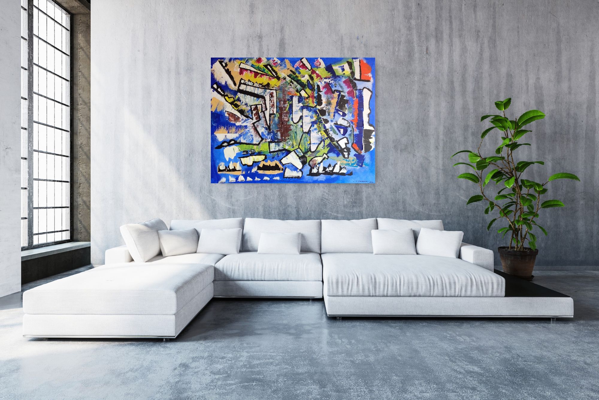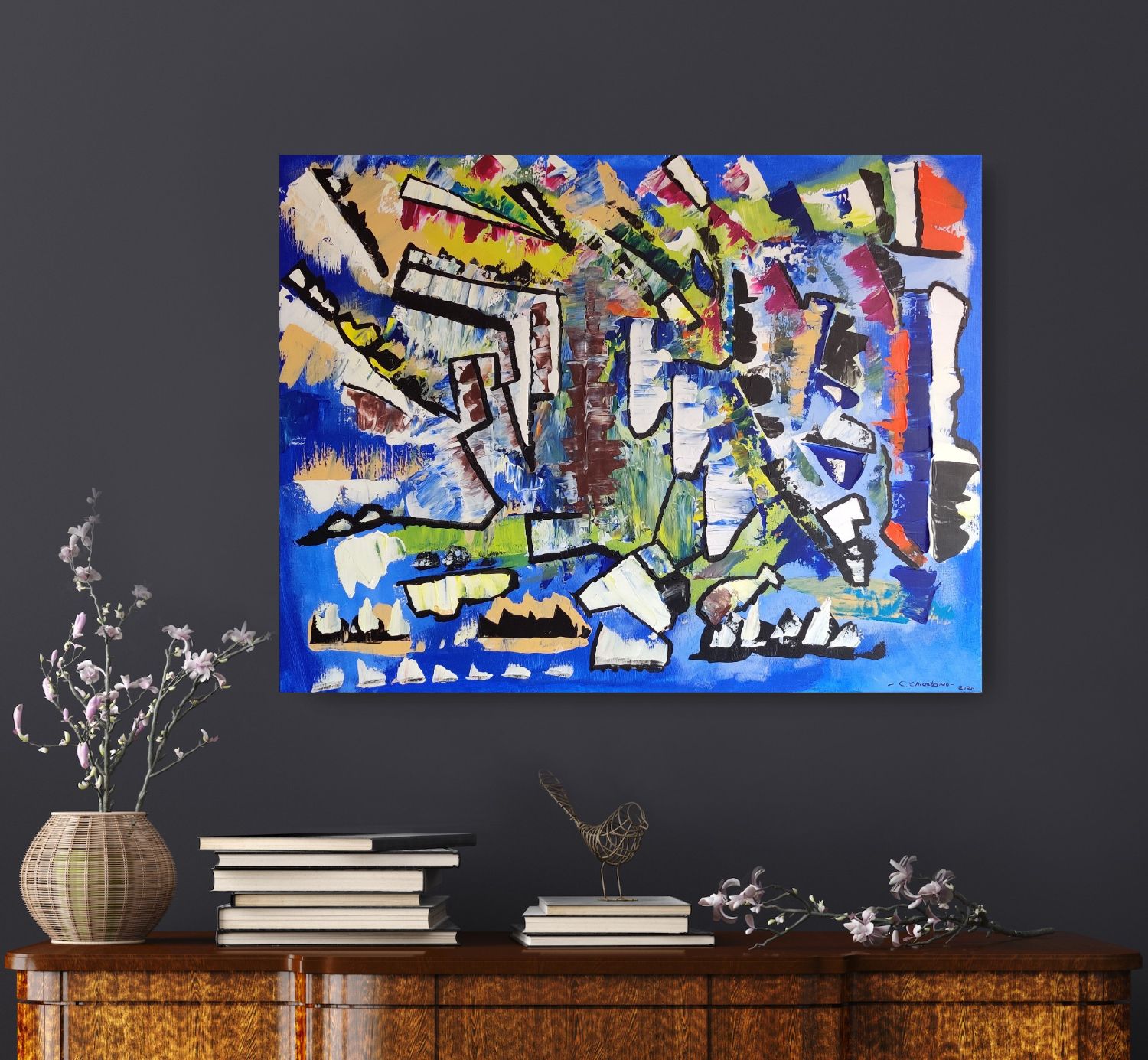 Slowly Sinking is a one-of-a-kind abstract acrylic painting measuring 80 × 100 cm, created using both brush and spatula to build a dense, tactile surface. The composition is dominated by deep blue tones, evoking a sense of depth, atmosphere, and emotional weight. Through layered gestures and fragmented forms, the painting explores gradual immersion and controlled instability.
